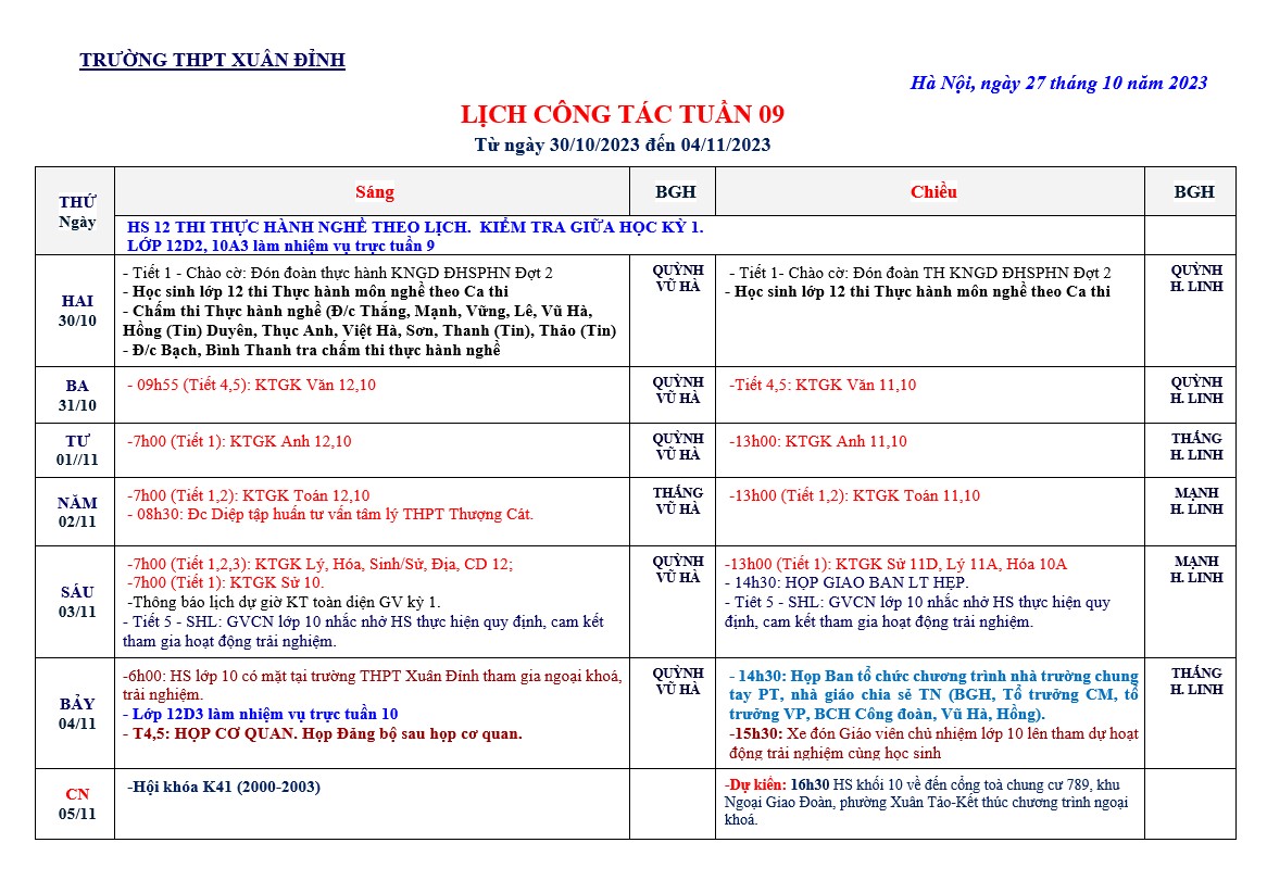 Lịch Công Tác Tuần 09 (NH: 2023-2024)