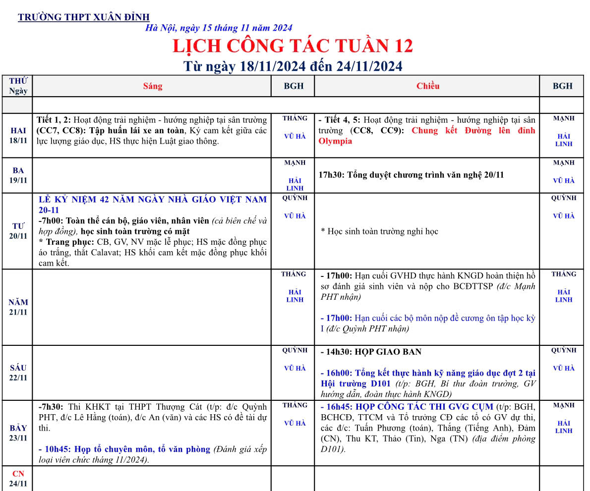 Lịch Công Tác Tuần 12 (NH: 2024-2025)