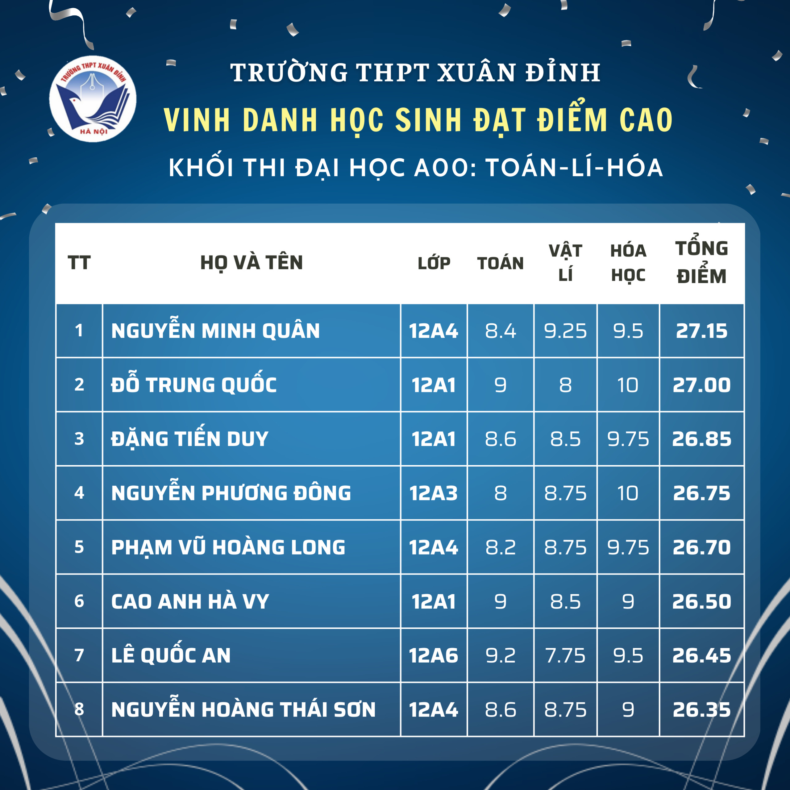 THPT XUÂN ĐỈNH CÔNG BỐ ĐỘI TUYỂN DỰ THI HỌC SINH GIỎI CẤP THÀNH PHỐ NĂM HỌC 2025 - 2026